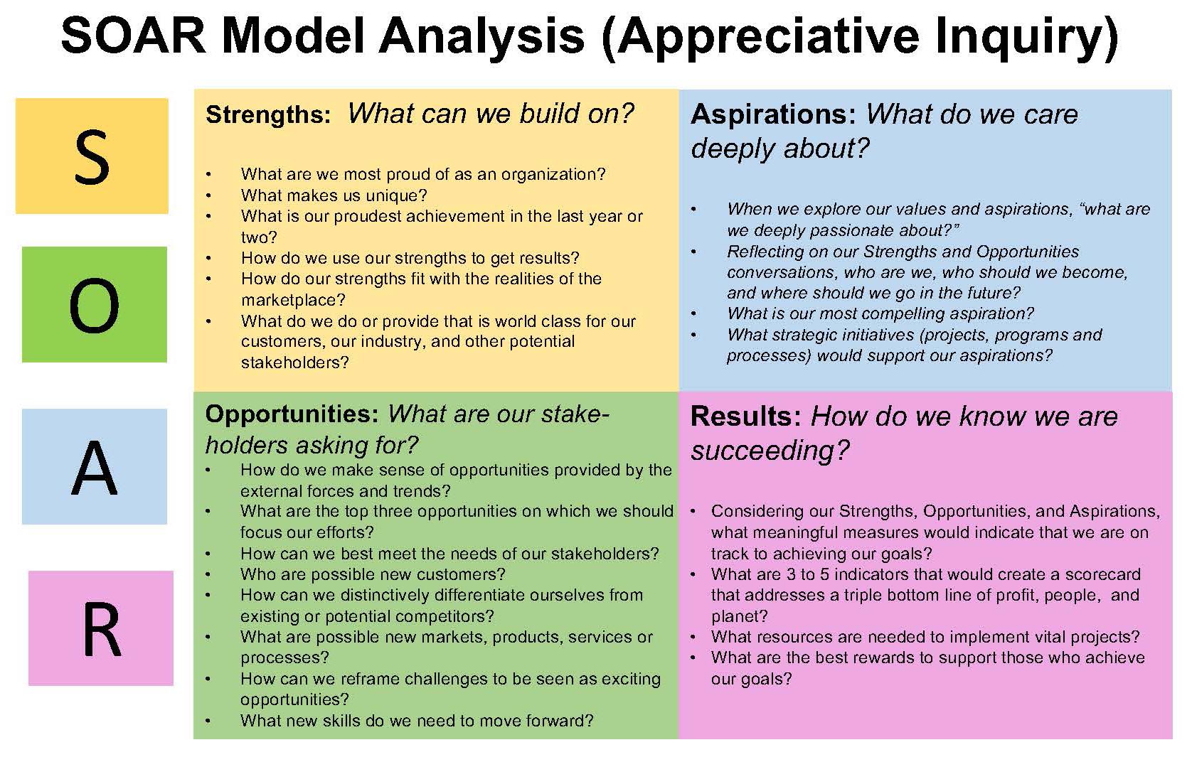 (From: Stavros, J. & Hinrichs, G. (2009). The thin book of SOAR: Building strengths-based strategy. Bend, OR : Thinbook Publishing.)